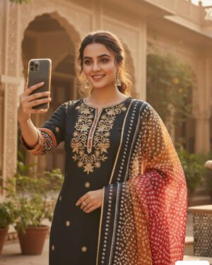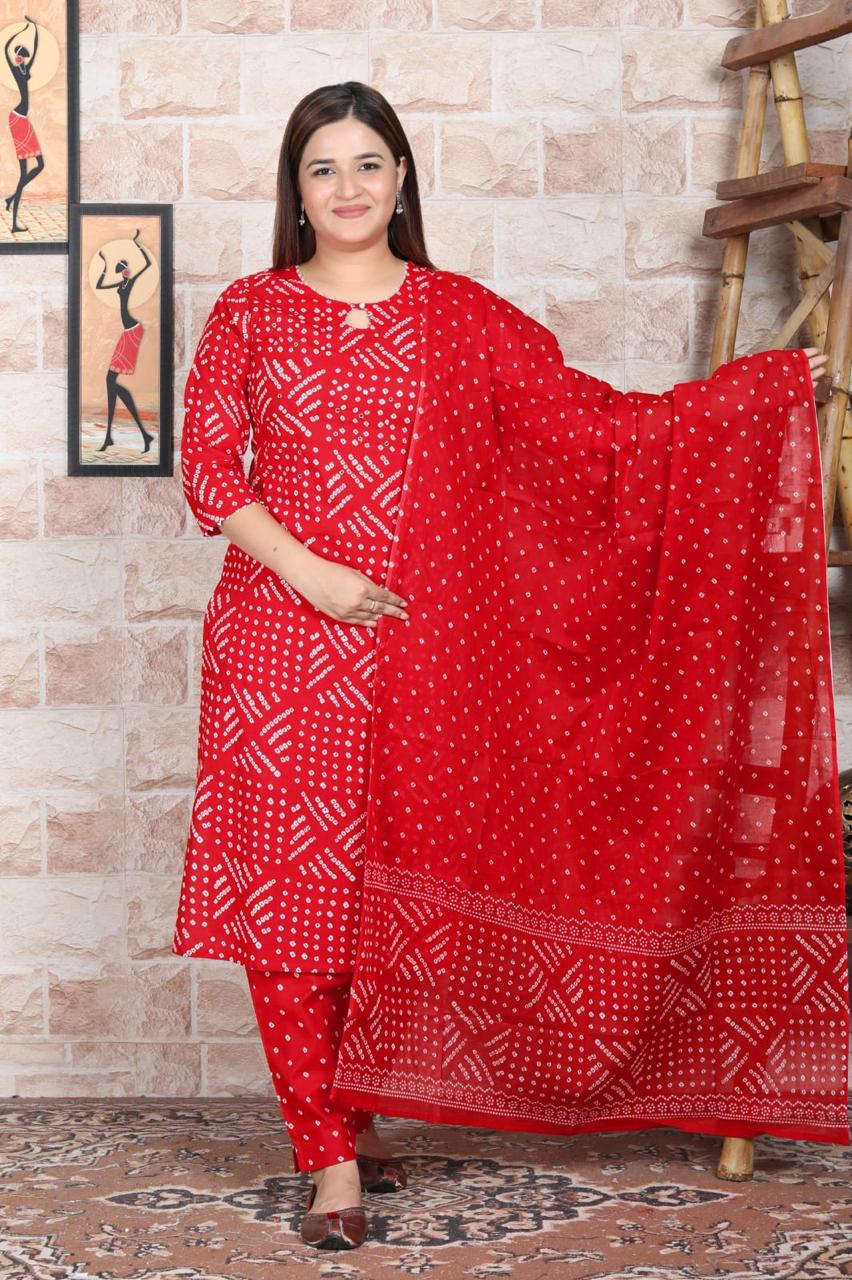 The set is paired with a soft cotton pant, finished with subtle golden lace detailing, ensuring a refined ethnic look. Completing the ensemble is a Chanderi Bandhani digital printed dupatta, which adds vibrant contrast and traditional charm to the outfit.