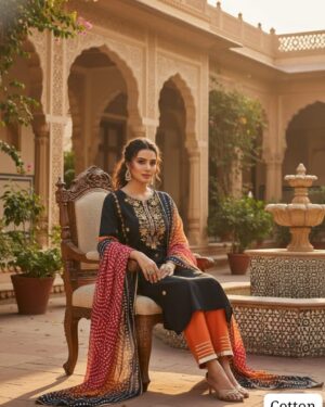 Elevate your ethnic wardrobe with this Black Pure Cotton 60Ć60 Embroidered Kurta Pant with Dupatta Set, designed for women who love elegance with comfort.