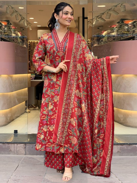 Floral Straight Kurta Pant Set with Dupatta | Women’s Cotton Ethnic Wear