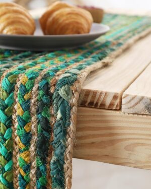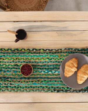 - Bring a warm and festive touch to your home with this handcrafted Green striped jute table runner, beautifully displayed on a natural wooden dining table. Its rich colors and rustic texture make it an ideal choice for everyday d?cor as well as special occasions.