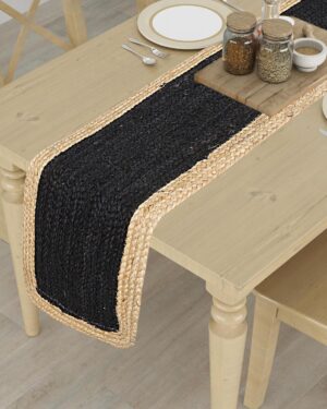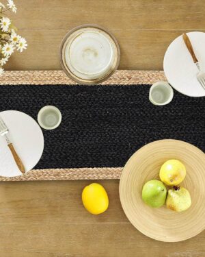 Enhance your dining space with this Handmade Natural Jute Table Runner featuring a Black Center and Natural Border. Carefully handwoven from 100% natural jute fibers, this runner combines a deep black center with a contrasting natural jute frame, creating a striking farmhouse and modern rustic look.